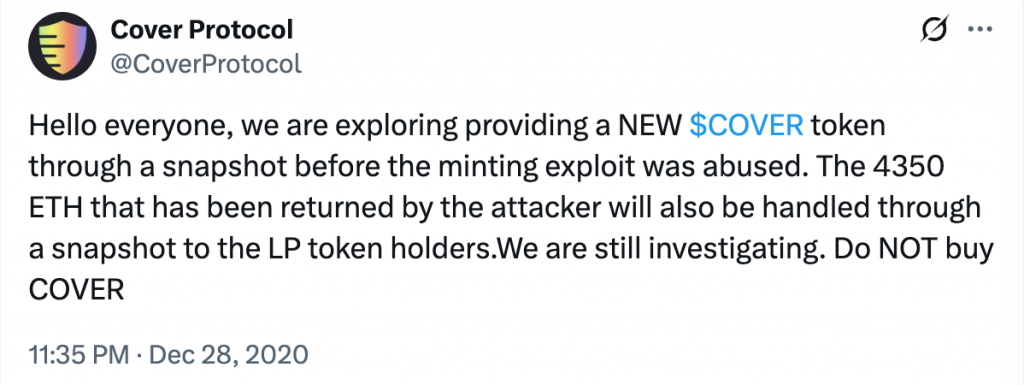 In 2020, insurance/derivatives protocol Cover suffered an “infinite mint” style incident. A logic error in its reward contract allowed an attacker to repeatedly claim rewards in a way that massively over-minted COVER tokens. The attacker dumped into secondary markets, effectively nuking the token price.